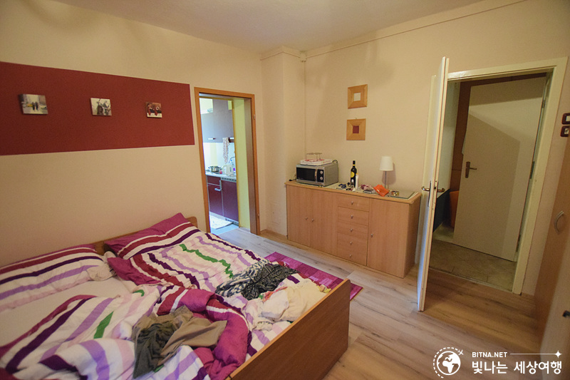 예약사이트 설명에서 살짝 애매했던 것이 이 숙소에 침실이 몇 개인가 하는 것이었다. 설명을 보면 침실이 두 개인듯 했는데, 사진상으로는 하나 뿐이었으니까. 결론은 거실 겸 주방 1개와 침실 1개, 즉 침실은 1개였다. (거실에 있는 소파가 침대로 변신가능한 것이라 오해를 산 듯) 거실 한 켠에 자리한 주방은 작지만 깨끗하고 조리도구와 식기들도 비교적 잘 갖춰져 있어 이유식 조리에 큰 어려움이 없었다. 어른 식사도 충분히 가능할 듯,